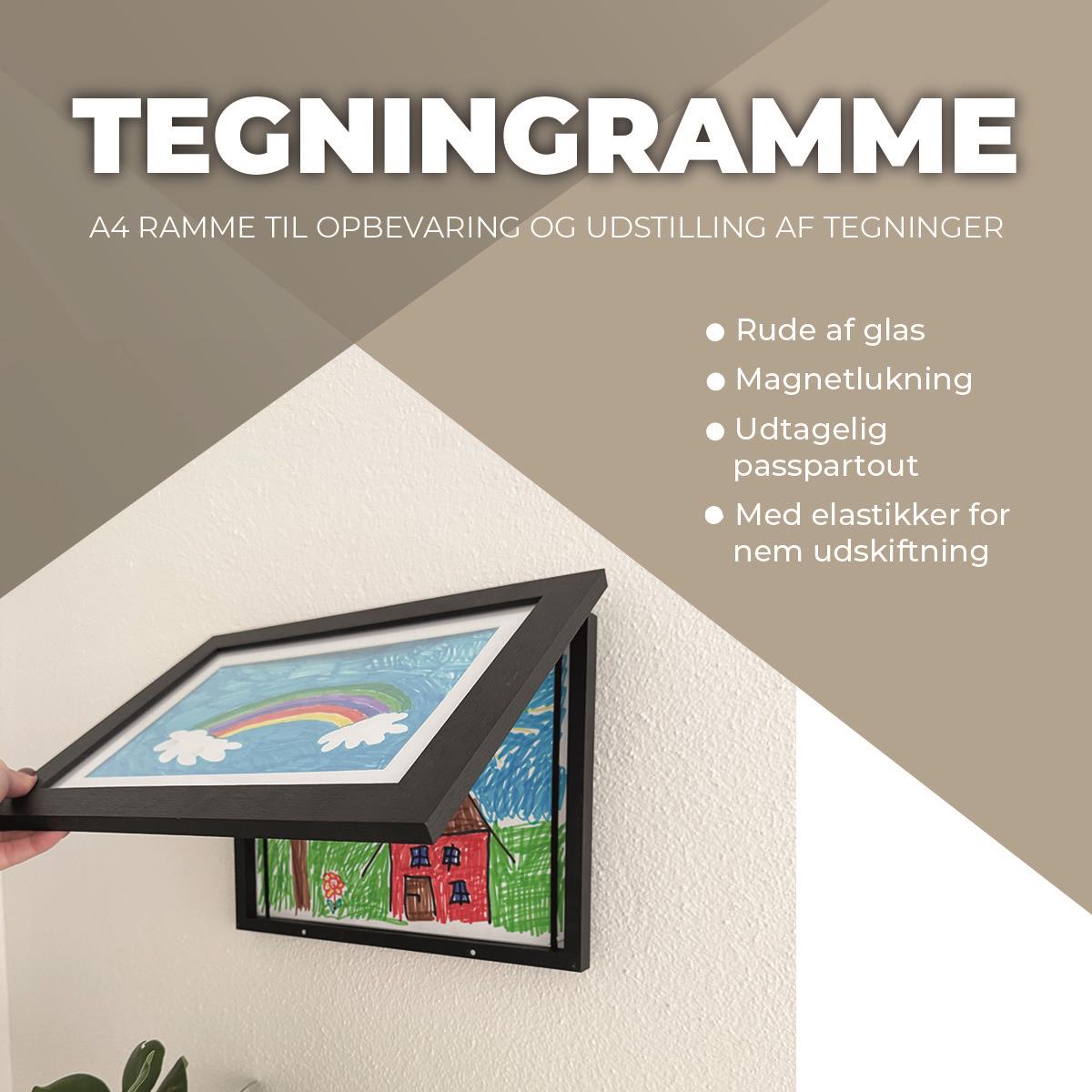 Med den praktiske magnetlukning, kan man nemt åbne rammen uden at tage den ned fra væggen, isætte den nye tegning, der bliver fastholdt af to elastikker, samt isætte den ”gamle” tegning bagved.